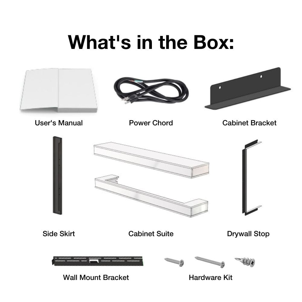 What's Included: Power Cord, Cabinet Brackets, Side Skirt, Top Cabinet, Bottom Cabinet, Drywall Stop, Wall Mount Bracket, Hardware Kit, and User's Manual