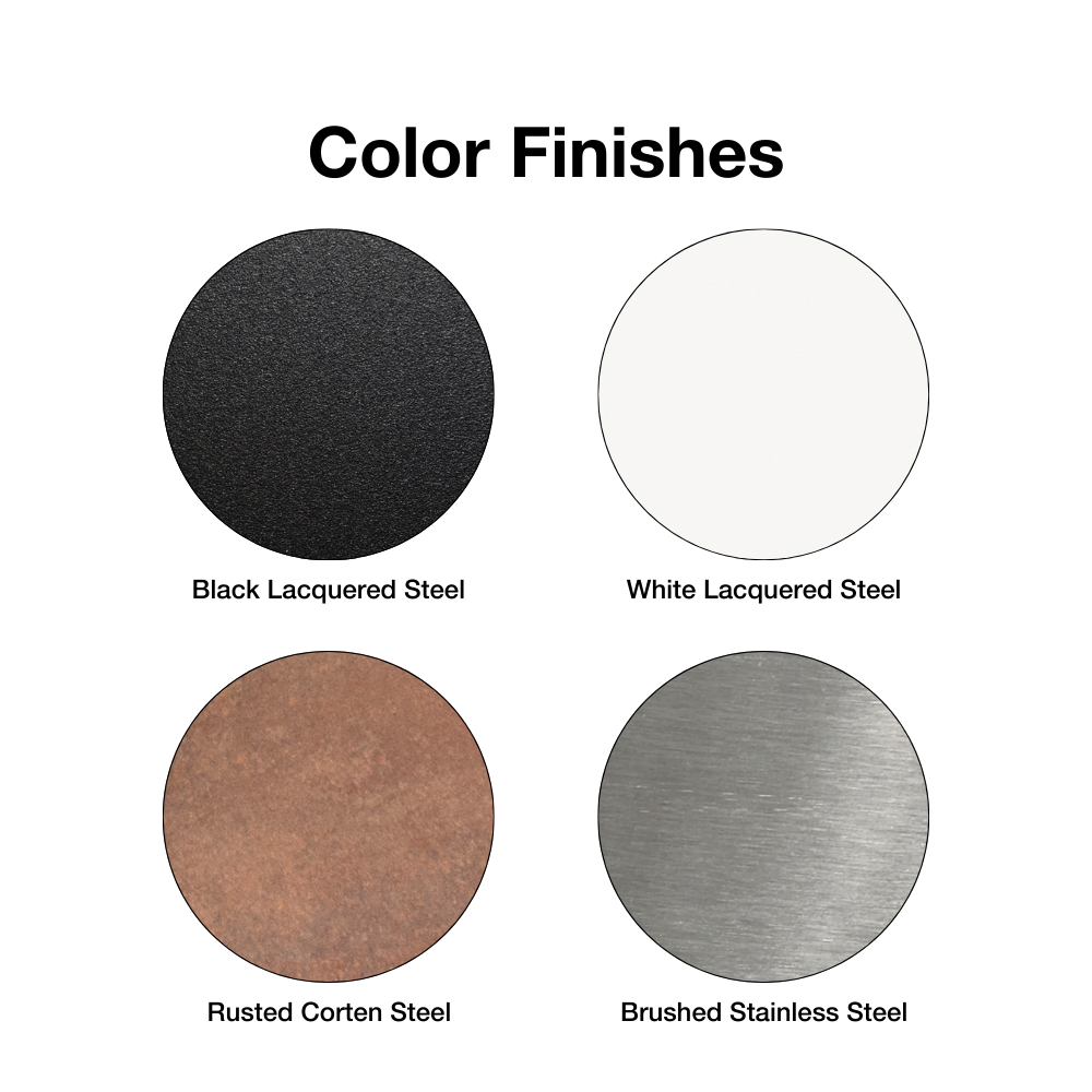 - Available in black lacquer, white lacquer, brushed stainless steel, or rusted corten steel finishes
