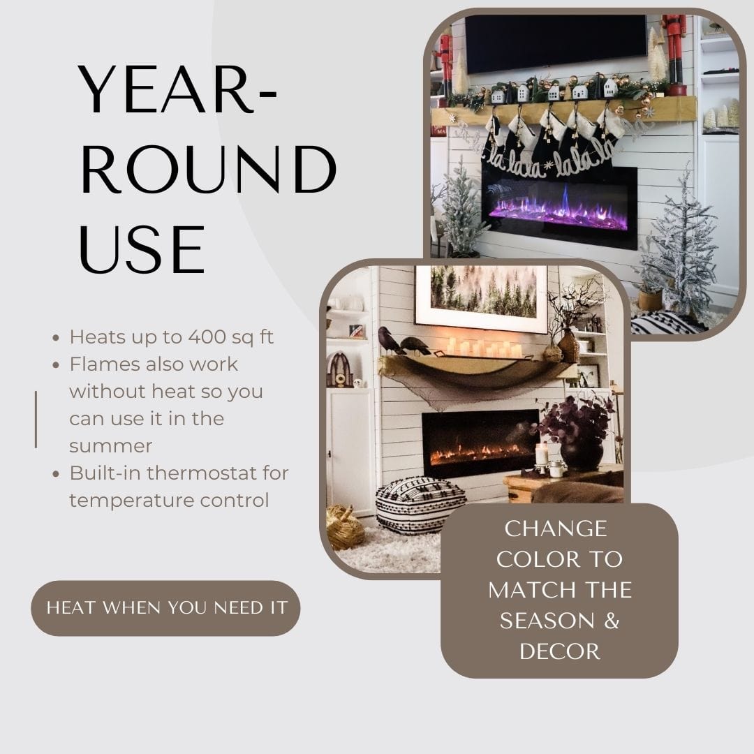 The fireplace has a quiet heater that works independently from the flames meaning that you can use your fireplace even in the summer. When you need the heat, it can heat up to 400 sq. ft. and has a thermostat control from 62 to 82 F.