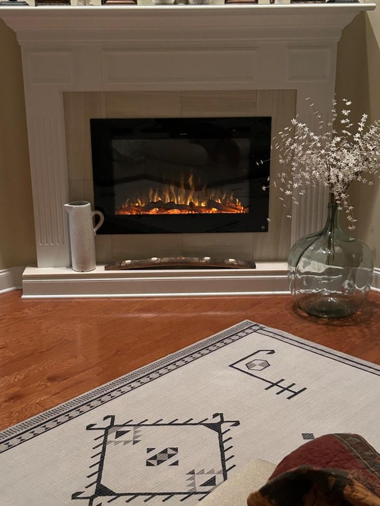 Being married to a builder I was skeptical about trying a “fake” fireplace but I wanted something for a room we plan to remodel in an small old house. We have it set in place to test it out while waiting on warm weather before beginning the remodeling project. I have to admit this was a nice surprise. The fireplace puts out plenty of heat, is fairly quiet and gives the room a nice glow in the evening. The “fake” fire looks amazing and it was nice that it came with the option of the log look, crystal glass for a modern look and off white rocks. We can already see that it will be easy to frame a small wall around it in the corner of the room. The glass front which covers the black surround gives the fireplace a very elegant, modern look that still has warmth and charm.