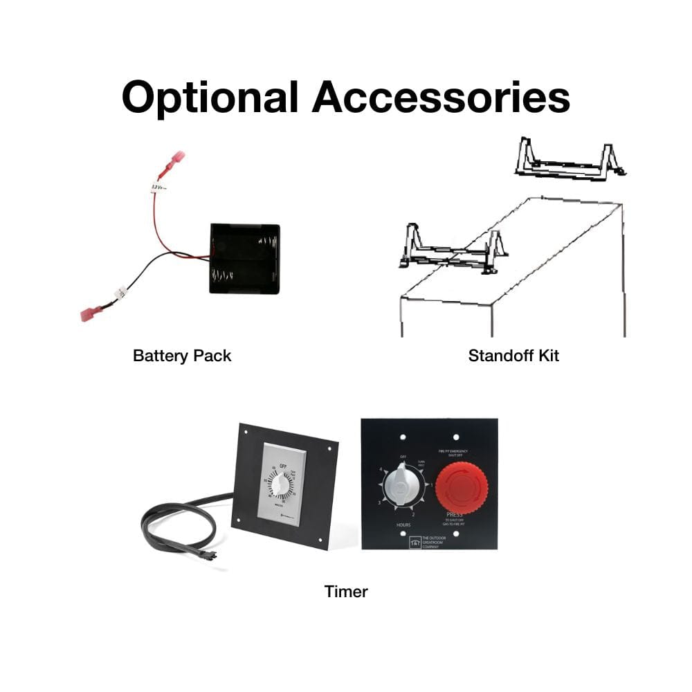 Optional Accessories: Timer, Standoff Kit, Battery Pack, Lava Rocks, and Fire Glass