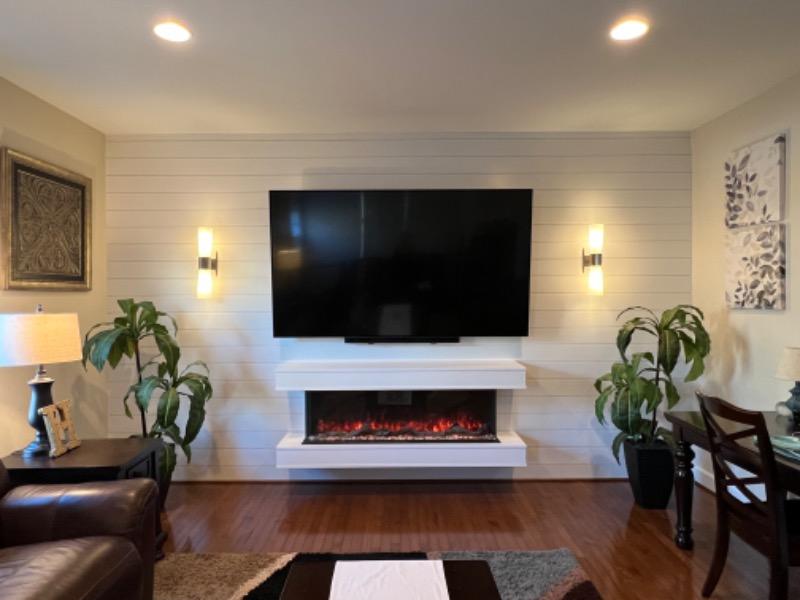 This cabinet is a BEAUTIFUL custom looking addition to the fireplace. For sizing reference, We purchased the 56” three sided fireplace and the TV mounted above is 86”. So glad we purchased the cabinet in addition to the fireplace. Modern Blaze was so helpful and we couldn’t be happier with how our project turned out.