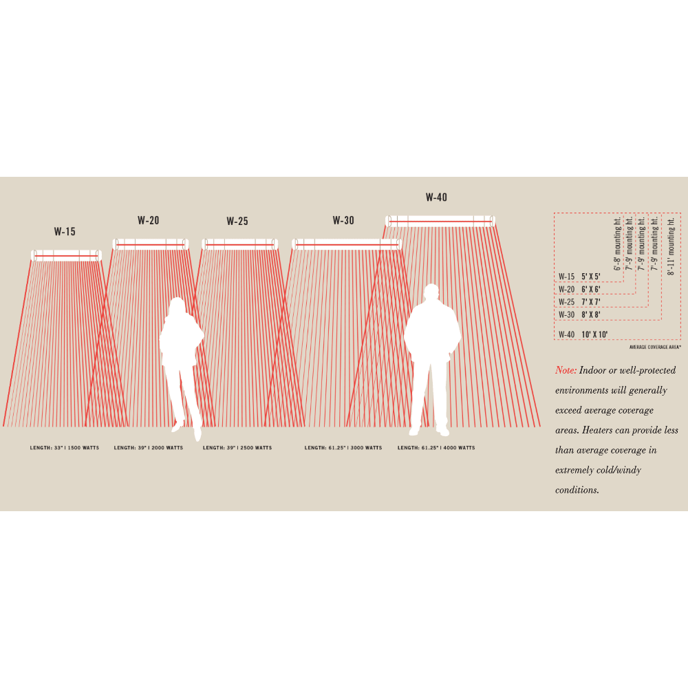 The W Series Electric Heater is energy efficient with wide, polished reflectors that provide comfortable and uniform heat coverage to an area of up to 5 x 5 ft. The maximum coverage area is achieved when properly installed and in ambient temperatures. For more information on heating coverage and setup recommendations, take a look at this helpful Infratech Heat Coverage Guide.
