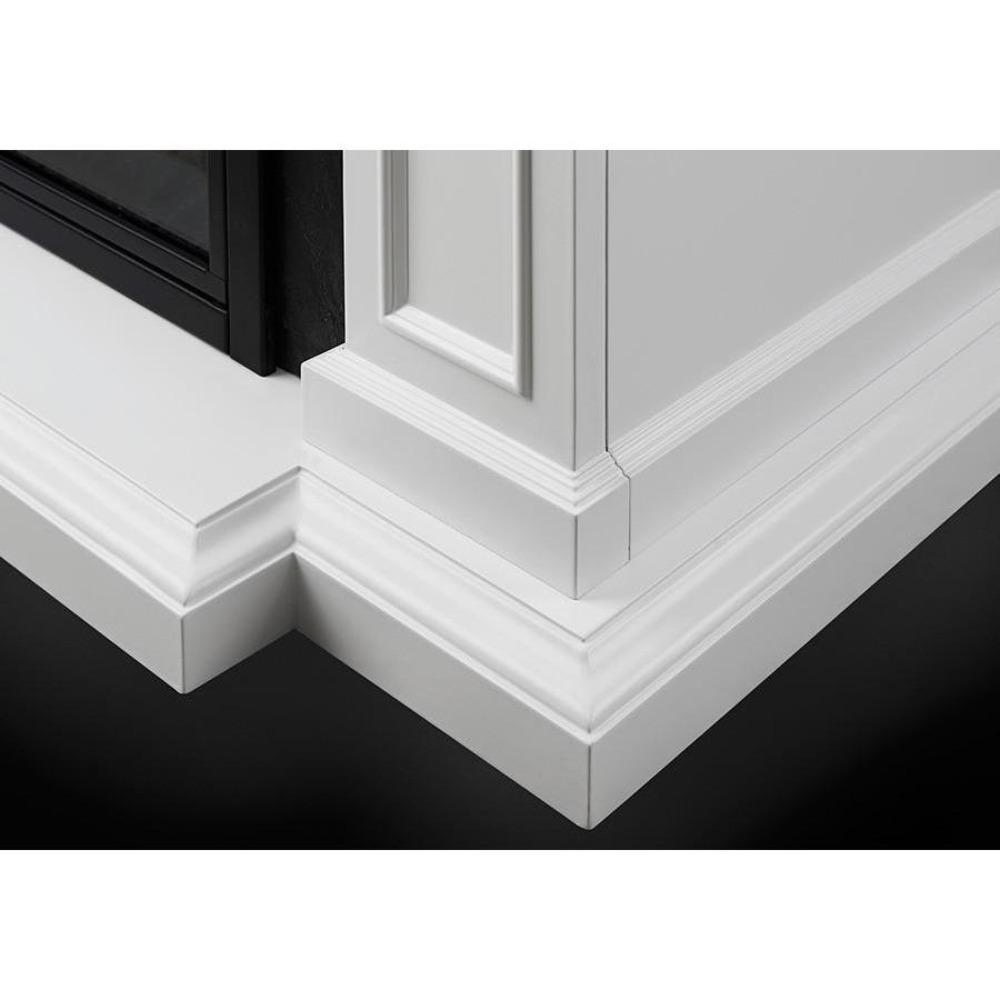 Its mantel encases your fireplace with decorative features in a white finish. The black slate-styled surround creates a stark contrast against the white finish and produces a modern and pure look for your fireplace. Dentil molding, ornamental focus point, and inset panels all emerge together creating an elegant and timeless piece set upon a prominent beveled base.